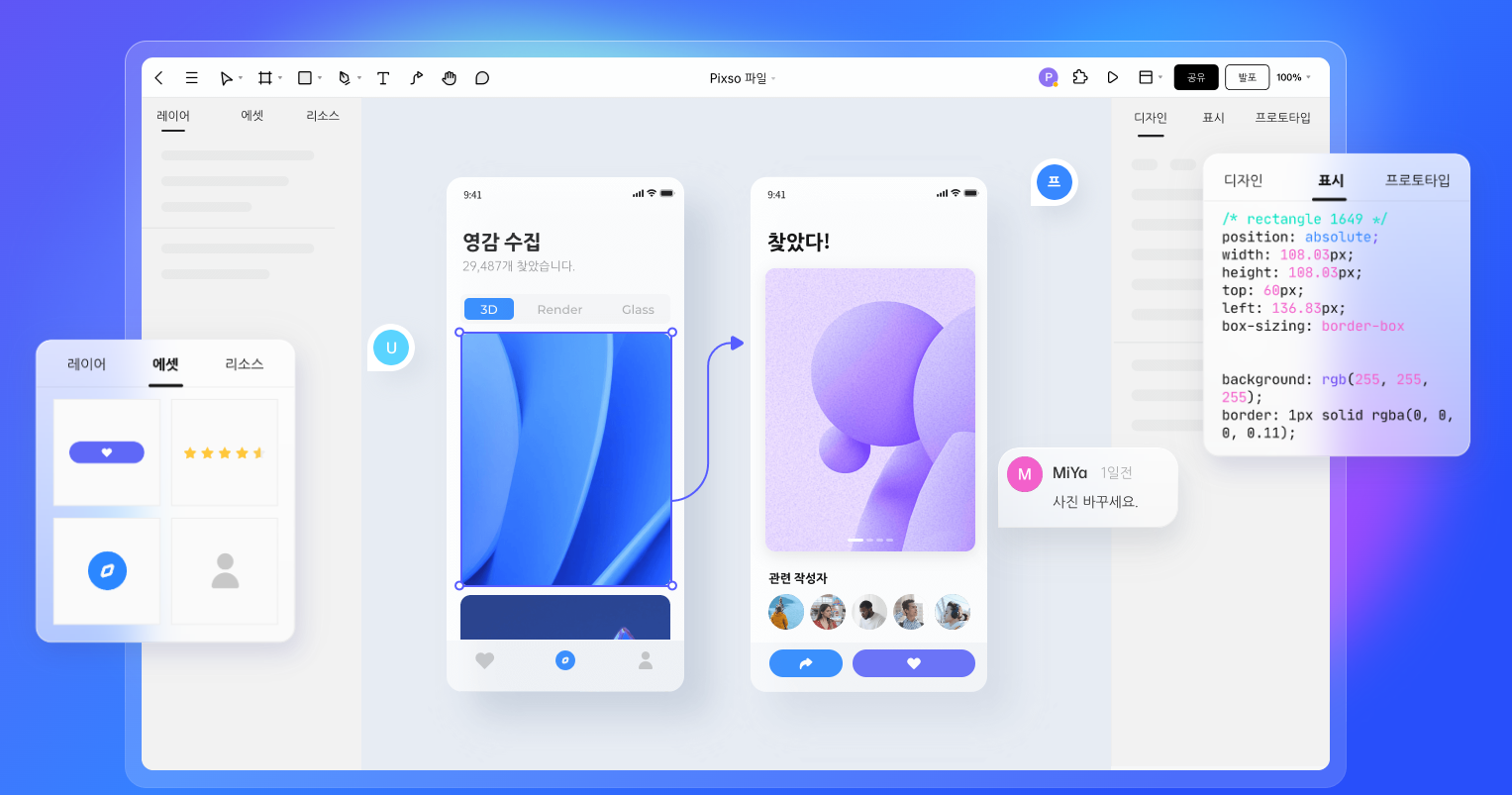 차세대 디자인 협업 도구 팀 단위로 훌륭한 제품을 만들고 실시간으로 디자인, 프로토타입 및 피드백을 수집합니다. Pixso에서 다양한 포맷 가져오기 지원(Figma, Sketch, Axure, Pixso, XD, SVG)으로 도구 전환이 필요 없습니다. 실시간 협업 같은 대상에 초점을 맞춥니다. 복잡한 디자인 프로젝트를 할 때 링크를 통해 팀원들을 요청하여 클라우드 협업 디자인을 진행하며, 글꼴, 테두리, 색상 등 다양한 디테일을 실시간으로 동기화합니다. 지능형 UI 디자인 도구 전문 기능을 빠르게 습득합니다. 전통적인 디자인은 많은 도구에 의존해야 효과를 기대할 수 있습니다. 반면에 Pixso는 자체 구성 요소 변형, 자동 배치 등 전문 디자인 도구를 갖추고 UI/UX 디자인과 프로토타입 재생을 지원하..