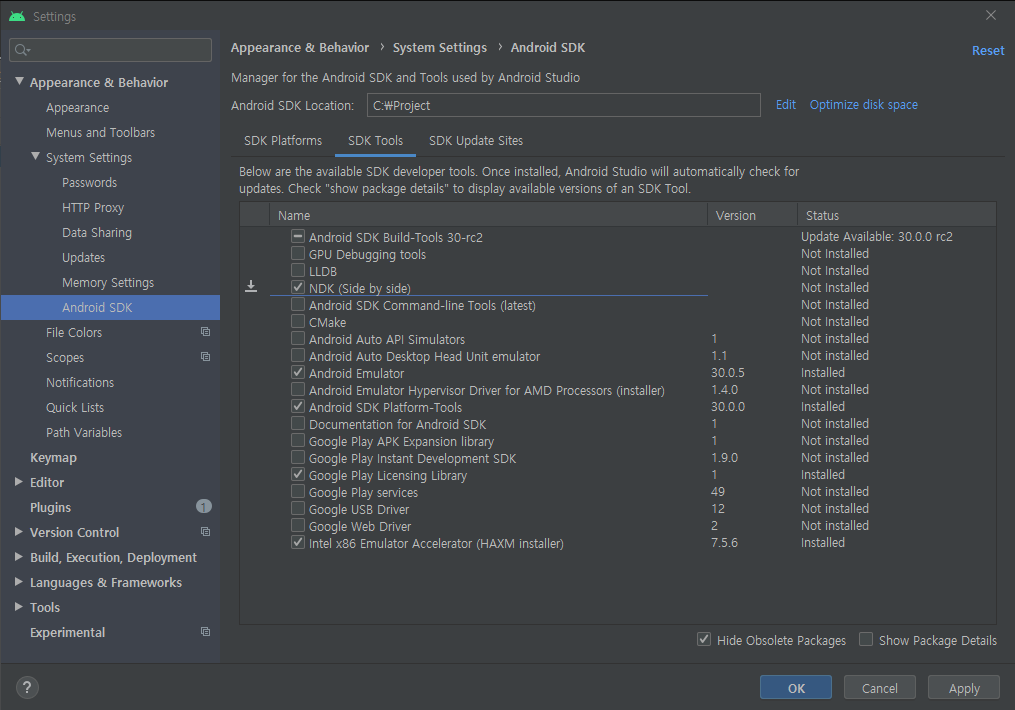 안드로이드 스튜디오 환경설정에서 NDK 설치